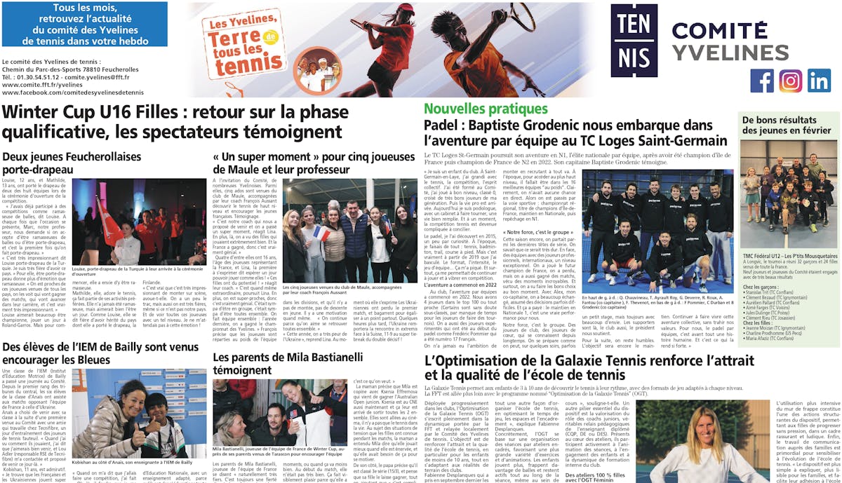 AccueilActualitésL'actu du Comité des YvelinesL'actu du Comité des YvelinesArticleTennisLe courrier des Yvelines23 janvier 2026Agrandir l'imageLien de l'article👉 Lire l’article sur Calaméo Sur le même sujetWinter cup 2026ArticleTennisWinter cup 20263 février 2026PROGRAMME FFT : DOUBLE MIXTE CHALLENGEArticleTennisPROGRAMME FFT : DOUBLE MIXTE CHALLENGE8 décembre 2025Annonce C'tennisArticleTennisAnnonce C'tennis24 juillet 2025Voir tous les articles