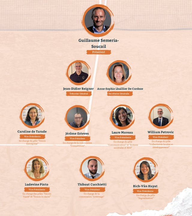 Le Bureau du Comité des Yvelines de Tennis est composé de 11 membres, femmes et hommes engagés pour le développement du tennis dans le département. Élu par le Comité Directeur, il met en œuvre la politique sportive et associative de la Fédération au niveau local.